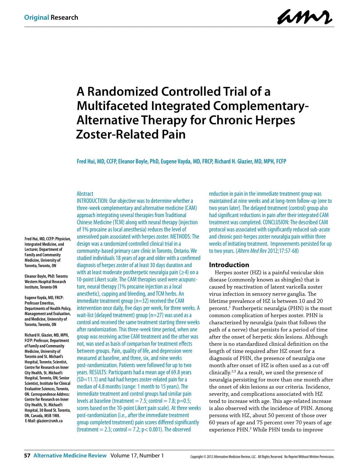Our objective was to determine whether a three-week complementary and alternative medicine (CAM) approach integrating several therapies from Traditional Chinese Medicine (TCM) along with neural therapy (injection of 1% procaine as local anesthesia) reduces the level of unresolved pain associated with herpes zoster. METHODS: The design was a randomized controlled clinical trial in a community-based primary care clinic in Toronto, Ontario. We studied individuals 18 years of age and older with a confirmed diagnosis of herpes zoster of at least 30 days duration and with at least moderate postherpetic neuralgia pain (≥4) on a 10-point Likert scale. The CAM therapies used were acupuncture, neural therapy (1% procaine injection as a local anesthetic), cupping and bleeding, and TCM herbs. An immediate treatment group (n=32) received the CAM intervention once daily, five days per week, for three weeks. A wait-list (delayed treatment) group (n=27) was used as a control and received the same treatment starting three weeks after randomization. This three-week time period, when one group was receiving active CAM treatment and the other was not, was used as basis of comparison for treatment effects between groups. Pain, quality of life, and depression were measured at baseline, and three, six, and nine weeks post-randomization. Patients were followed for up to two years. RESULTS: Participants had a mean age of 69.8 years (SD=11.1) and had had herpes zoster-related pain for a median of 4.8 months (range: 1 month to 15 years). The immediate treatment and control groups had similar pain levels at baseline (treatment = 7.5; control = 7.8; p=0.5; scores based on the 10-point Likert pain scale). At three weeks post-randomization (i.e., after the immediate treatment group completed treatment) pain scores differed significantly (treatment = 2.3; control = 7.2; p< 0.001). The observed reduction in pain in the immediate treatment group was maintained at nine weeks and at long-term follow-up (one to two years later). The delayed treatment (control) group also had significant reductions in pain after their integrated CAM treatment was completed. CONCLUSION: The described CAM protocol was associated with significantly reduced sub-acute and chronic post-herpes zoster neuralgia pain within three weeks of initiating treatment. Improvements persisted for up to two years. (Altern Med Rev 2012;17:57-68)