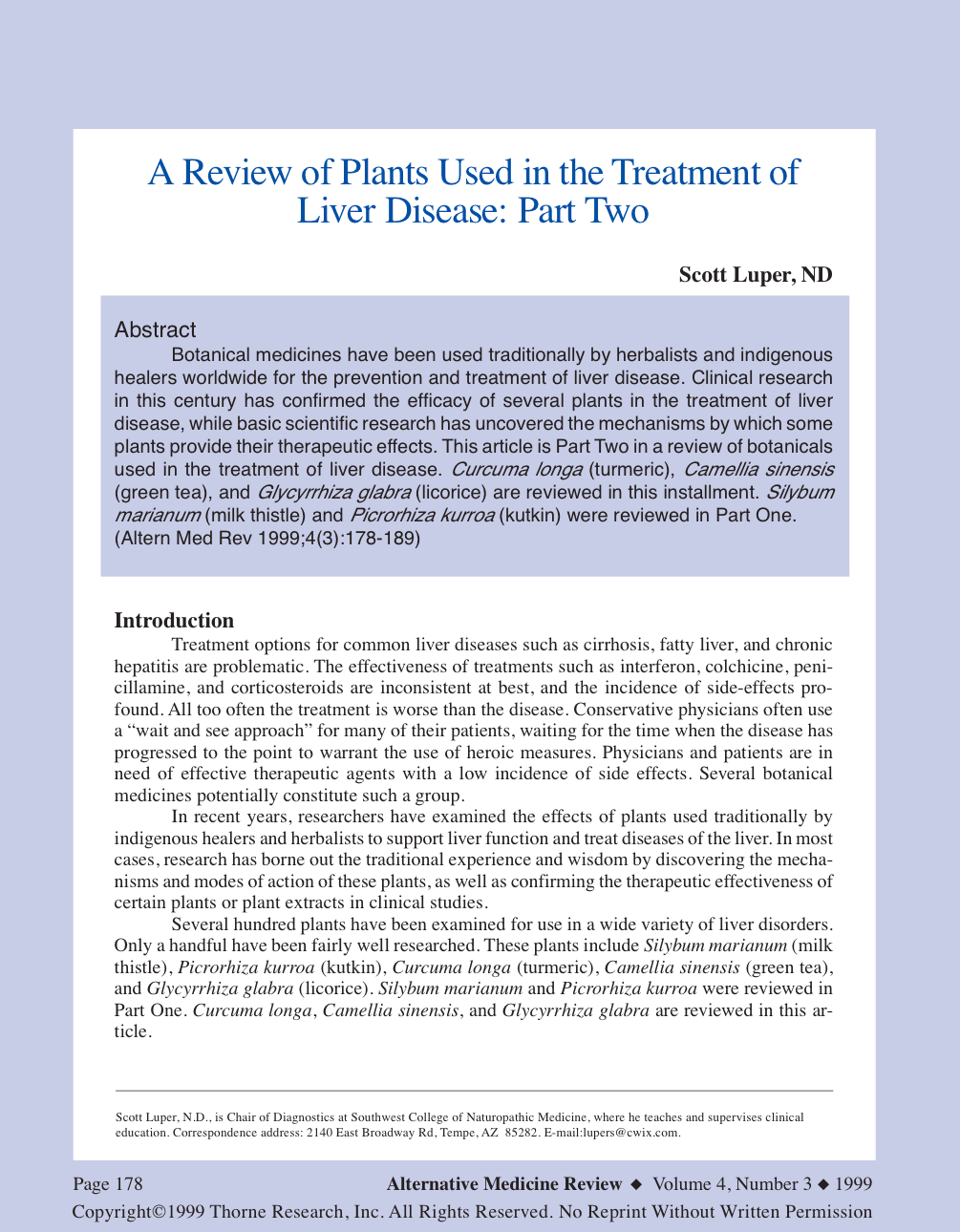 Botanical medicines have been used traditionally by herbalists and indigenous healers worldwide for the prevention and treatment of liver disease. Clinical research in this century has confirmed the efficacy of several plants in the treatment of liver disease, while basic scientific research has uncovered the mechanisms by which some plants provide their therapeutic effects. This article is Part Two in a review of botanicals used in the treatment of liver disease. Curcuma longa (turmeric), Camellia sinensis (green tea), and Glycyrrhiza glabra (licorice) are reviewed in this installment. Silybum marianum (milk thistle) and Picrorhiza kurroa (kutkin) were reviewed in Part One. (Altern Med Rev 1999;4(3):178-189)