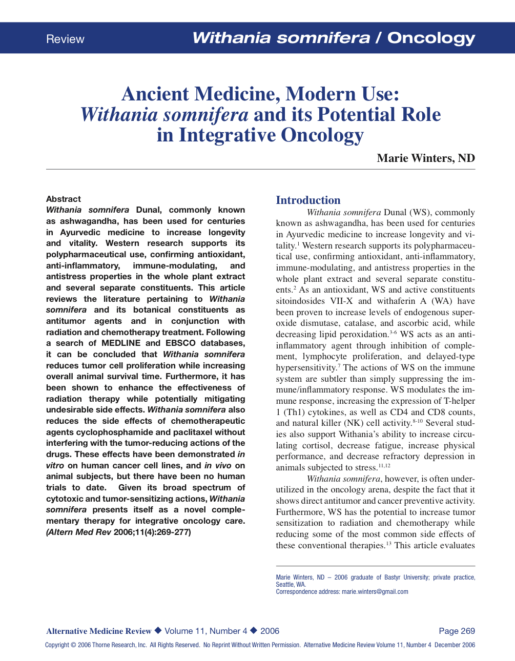 Withania somnifera Dunal, commonly known as ashwagandha, has been used for centuries in Ayurvedic medicine to increase longevity and vitality. Western research supports its polypharmaceutical use, confirming antioxidant, anti-inflammatory, immune-modulating, and antistress properties in the whole plant extract and several separate constituents. This article reviews the literature pertaining to Withania somnifera and its botanical constituents as antitumor agents and in conjunction with radiation and chemotherapy treatment. Following a search of MEDLINE and EBSCO databases, it can be concluded that Withania somnifera reduces tumor cell proliferation while increasing overall animal survival time. Furthermore, it has been shown to enhance the effectiveness of radiation therapy while potentially mitigating undesirable side effects. Withania somnifera also reduces the side effects of chemotherapeutic agents cyclophosphamide and paclitaxel without interfering with the tumor-reducing actions of the drugs. These effects have been demonstrated in vitro on human cancer cell lines, and in vivo on animal subjects, but there have been no human trials to date. Given its broad spectrum of cytotoxic and tumor-sensitizing actions, Withania somnifera presents itself as a novel complementary therapy for integrative oncology care. (Altern Med Rev 2006;11(4):269-277)