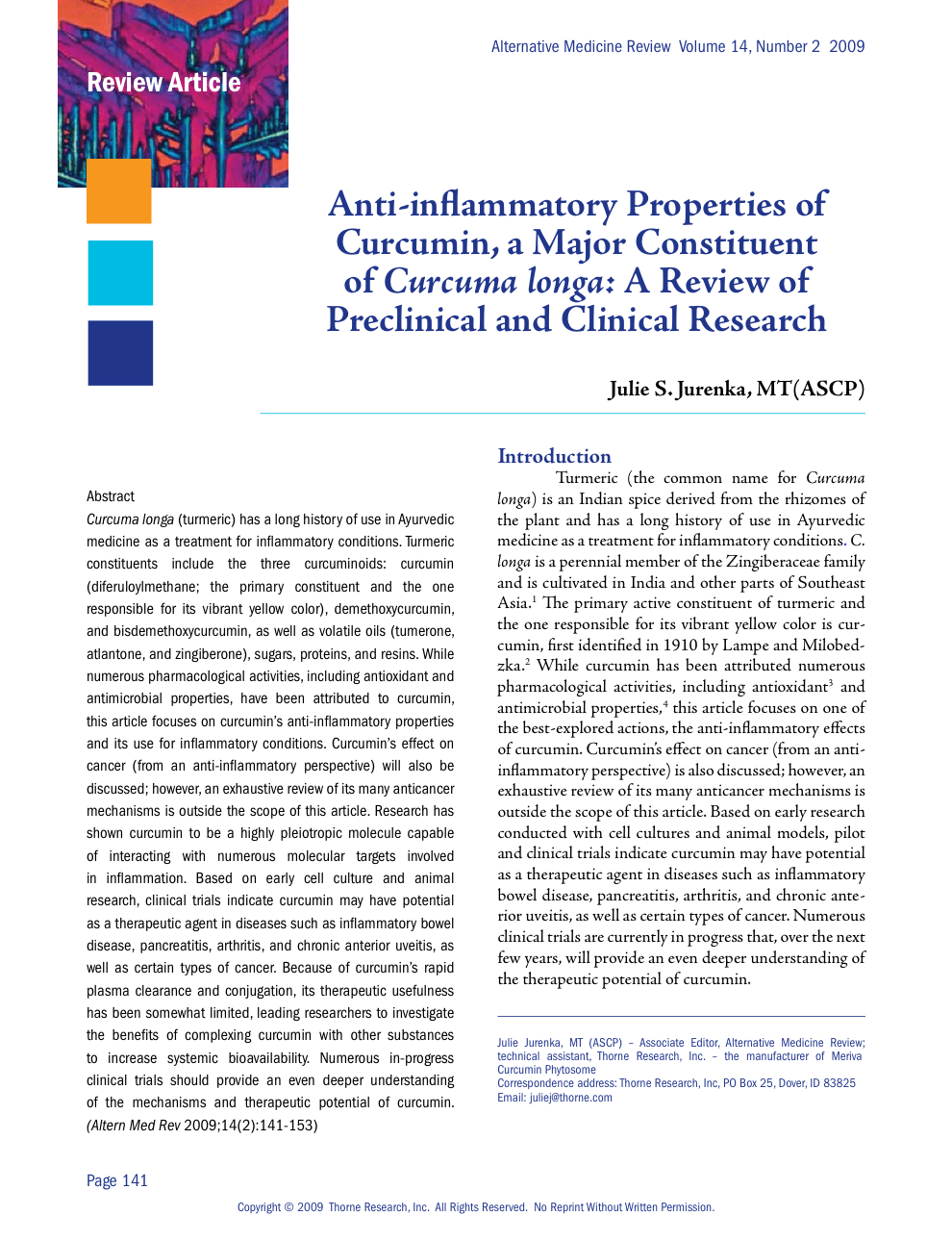 Curcuma longa (turmeric) has a long history of use in Ayurvedic medicine as a treatment for inflammatory conditions. Turmeric constituents include the three curcuminoids: curcumin (diferuloylmethane; the primary constituent and the one responsible for its vibrant yellow color), demethoxycurcumin, and bisdemethoxycurcumin, as well as volatile oils (tumerone, atlantone, and zingiberone), sugars, proteins, and resins. While numerous pharmacological activities, including antioxidant and antimicrobial properties, have been attributed to curcumin, this article focuses on curcumin’s anti-inflammatory properties and its use for inflammatory conditions. Curcumin’s effect on cancer (from an anti-inflammatory perspective) will also be discussed; however, an exhaustive review of its many anticancer mechanisms is outside the scope of this article. Research has shown curcumin to be a highly pleiotropic molecule capable of interacting with numerous molecular targets involved in inflammation. Based on early cell culture and animal research, clinical trials indicate curcumin may have potential as a therapeutic agent in diseases such as inflammatory bowel disease, pancreatitis, arthritis, and chronic anterior uveitis, as well as certain types of cancer. Because of curcumin’s rapid plasma clearance and conjugation, its therapeutic usefulness has been somewhat limited, leading researchers to investigate the benefits of complexing curcumin with other substances to increase systemic bioavailability. Numerous in-progress clinical trials should provide an even deeper understanding of the mechanisms and therapeutic potential of curcumin. (Altern Med Rev 2009;14(2):141-153)