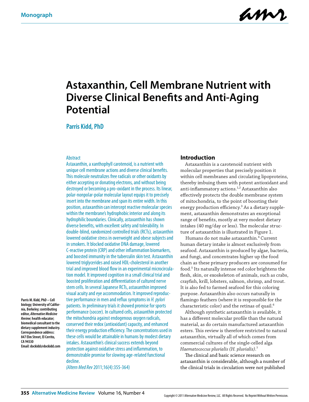 Astaxanthin, a xanthophyll carotenoid, is a nutrient with unique cell membrane actions and diverse clinical benefits. This molecule neutralizes free radicals or other oxidants by either accepting or donating electrons, and without being destroyed or becoming a pro-oxidant in the process. Its linear, polar-nonpolar-polar molecular layout equips it to precisely insert into the membrane and span its entire width. In this position, astaxanthin can intercept reactive molecular species within the membrane’s hydrophobic interior and along its hydrophilic boundaries. Clinically, astaxanthin has shown diverse benefits, with excellent safety and tolerability. In double-blind, randomized controlled trials (RCTs), astaxanthin lowered oxidative stress in overweight and obese subjects and in smokers. It blocked oxidative DNA damage, lowered C-reactive protein (CRP) and other inflammation biomarkers, and boosted immunity in the tuberculin skin test. Astaxanthin lowered triglycerides and raised HDL-cholesterol in another trial and improved blood flow in an experimental microcirculation model. It improved cognition in a small clinical trial and boosted proliferation and differentiation of cultured nerve stem cells. In several Japanese RCTs, astaxanthin improved visual acuity and eye accommodation. It improved reproductive performance in men and reflux symptoms in H. pylori patients. In preliminary trials it showed promise for sports performance (soccer). In cultured cells, astaxanthin protected the mitochondria against endogenous oxygen radicals, conserved their redox (antioxidant) capacity, and enhanced their energy production efficiency. The concentrations used in these cells would be attainable in humans by modest dietary intakes. Astaxanthin’s clinical success extends beyond protection against oxidative stress and inflammation, to demonstrable promise for slowing age-related functional decline. (Altern Med Rev 2011;16(4):355-364)