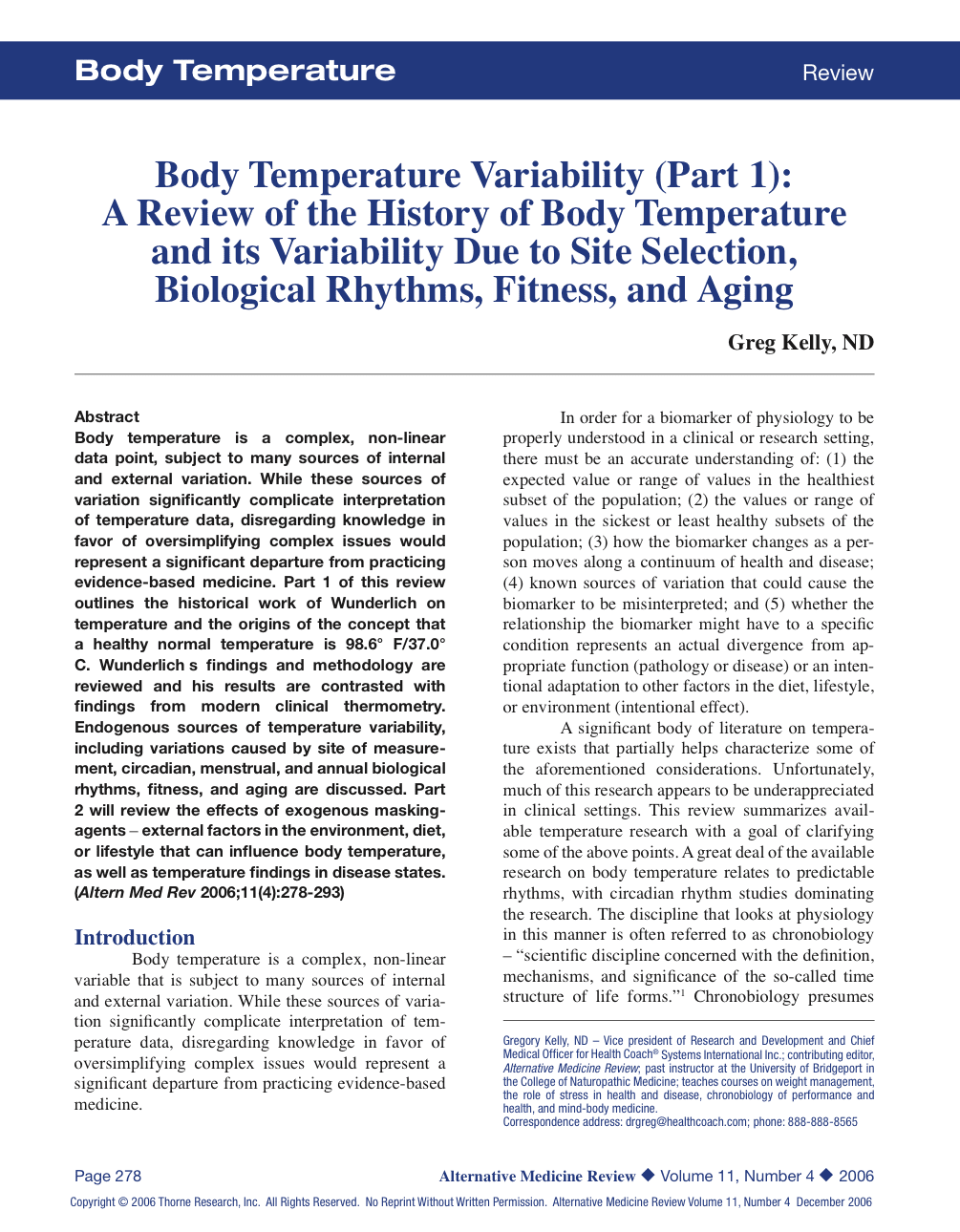 Body temperature is a complex, non-linear data point, subject to many sources of internal and external variation. While these sources of variation significantly complicate interpretation of temperature data, disregarding knowledge in favor of oversimplifying complex issues would represent a significant departure from practicing evidence-based medicine. Part 1 of this review outlines the historical work of Wunderlich on temperature and the origins of the concept that a healthy normal temperature is 98.6° F/37.0° C. Wunderlichs findings and methodology are reviewed and his results are contrasted with findings from modern clinical thermometry. Endogenous sources of temperature variability, including variations caused by site of measure- ment, circadian, menstrual, and annual biological rhythms, fitness, and aging are discussed. Part 2 will review the effects of exogenous masking- agents – external factors in the environment, diet, or lifestyle that can influence body temperature, as well as temperature findings in disease states. (Altern Med Rev 2006;11(4):278-293)