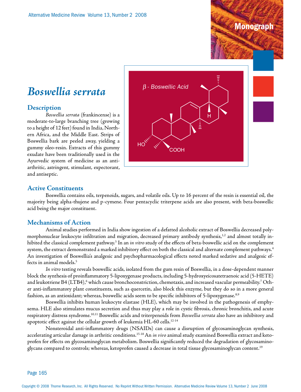 Boswellia serrata (frankincense) is a moderate-to-large branching tree (growing to a height of 12 feet) found in India, Northern Africa, and the Middle East. Strips of Boswellia bark are peeled away, yielding a gummy oleo-resin. Extracts of this gummy exudate have been traditionally used in the Ayurvedic system of medicine as an antiarthritic, astringent, stimulant, expectorant, and antiseptic.