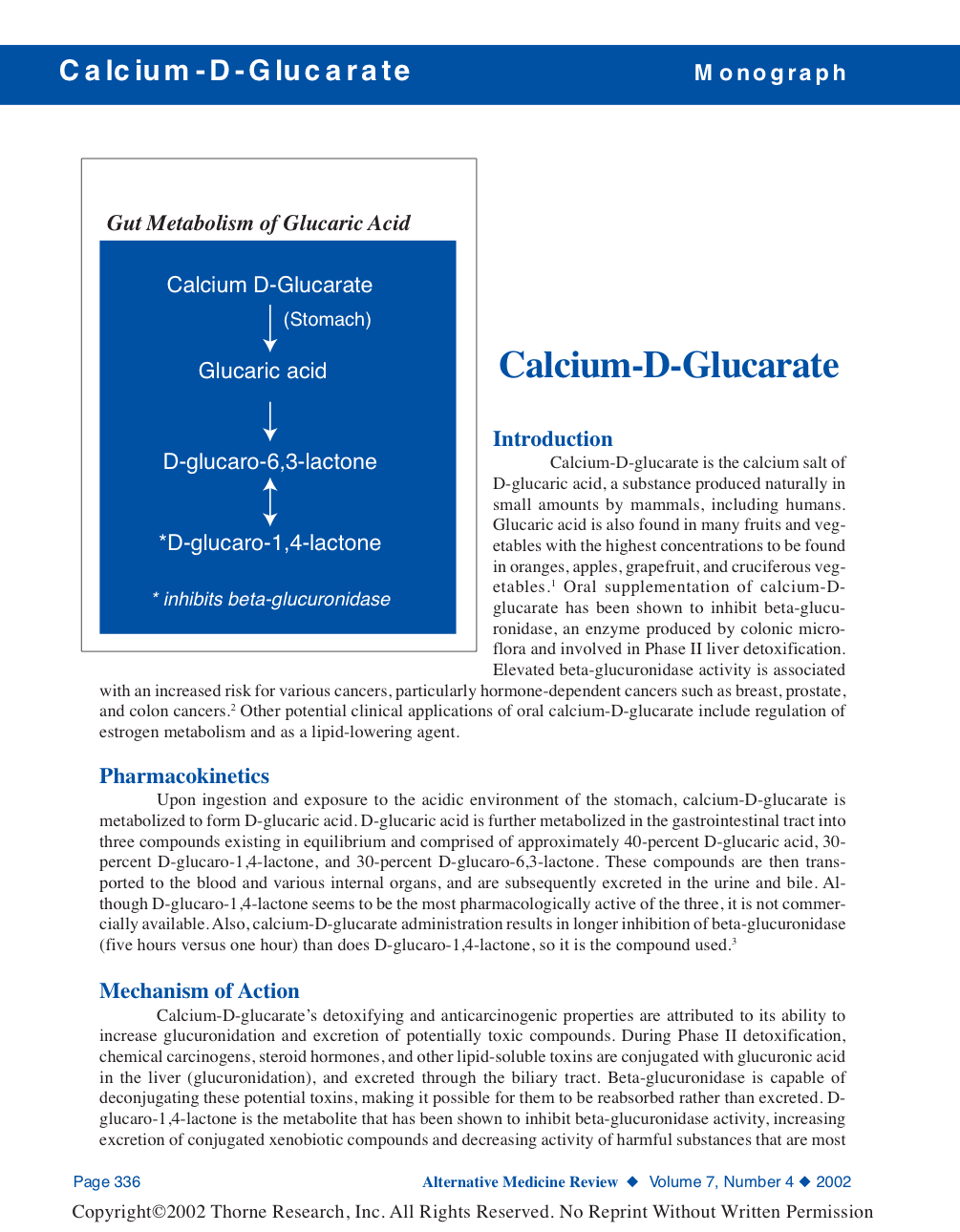 Calcium-D-glucarate is the calcium salt of D-glucaric acid, a substance produced naturally in small amounts by mammals, including humans. Glucaric acid is also found in many fruits and vegetables with the highest concentrations to be found in oranges, apples, grapefruit, and cruciferous vegetables. 1 Oral supplementation of calcium-Dglucarate has been shown to inhibit beta-glucuronidase, an enzyme produced by colonic microflora and involved in Phase II liver detoxification. Elevated beta-glucuronidase activity is associated with an increased risk for various cancers, particularly hormone-dependent cancers such as breast, prostate, and colon cancers.2 Other potential clinical applications of oral calcium-D-glucarate include regulation of estrogen metabolism and as a lipid-lowering agent.
