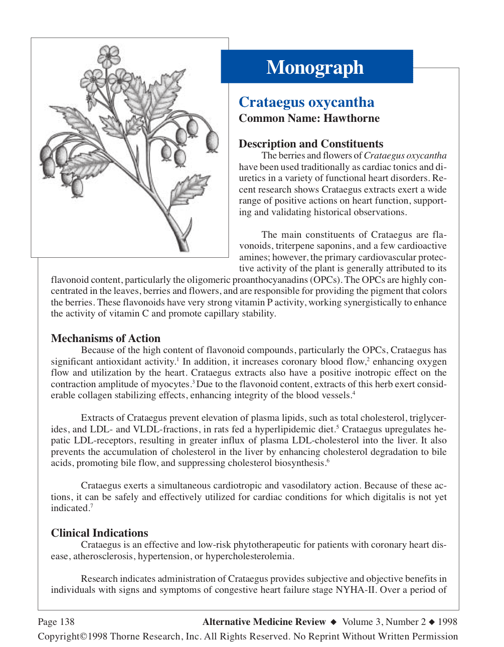 The berries and flowers of Crataegus oxycantha have been used traditionally as cardiac tonics and diuretics in a variety of functional heart disorders. Recent research shows Crataegus extracts exert a wide range of positive actions on heart function, supporting and validating historical observations.