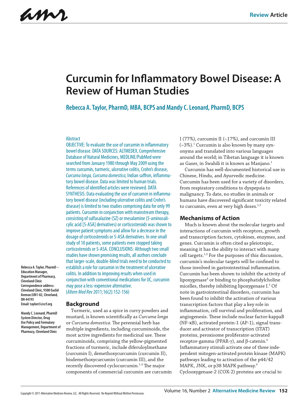 OBJECTIVE: To evaluate the use of curcumin in inflammatory bowel disease. DATA SOURCES: ALTMEDEX, Comprehensive Database of Natural Medicines, MEDLINE/PubMed were searched from January 1980 through May 2009 using the terms curcumin, turmeric, ulcerative colitis, Crohn’s disease, Curcuma longa, Curcuma domestica, Indian saffron, inflammatory bowel disease. Data was limited to human trials. References of identified articles were reviewed. DATA SYNTHESIS: Data evaluating the use of curcumin in inflammatory bowel disease (including ulcerative colitis and Crohn’s disease) is limited to two studies comprising data for only 99 patients. Curcumin in conjunction with mainstream therapy, consisting of sulfasalazine (SZ) or mesalamine (5-aminosalicylic acid [5-ASA] derivatives) or corticosteroids was shown to improve patient symptoms and allow for a decrease in the dosage of corticosteroids or 5-ASA derivatives. In one small study of 10 patients, some patients even stopped taking corticosteroids or 5-ASA. CONCLUSIONS: Although two small studies have shown promising results, all authors conclude that larger-scale, double-blind trials need to be conducted to establish a role for curcumin in the treatment of ulcerative colitis. In addition to improving results when used in conjunction with conventional medications for UC, curcumin may pose a less-expensive alternative. (Altern Med Rev 2011;16(2):152-156)