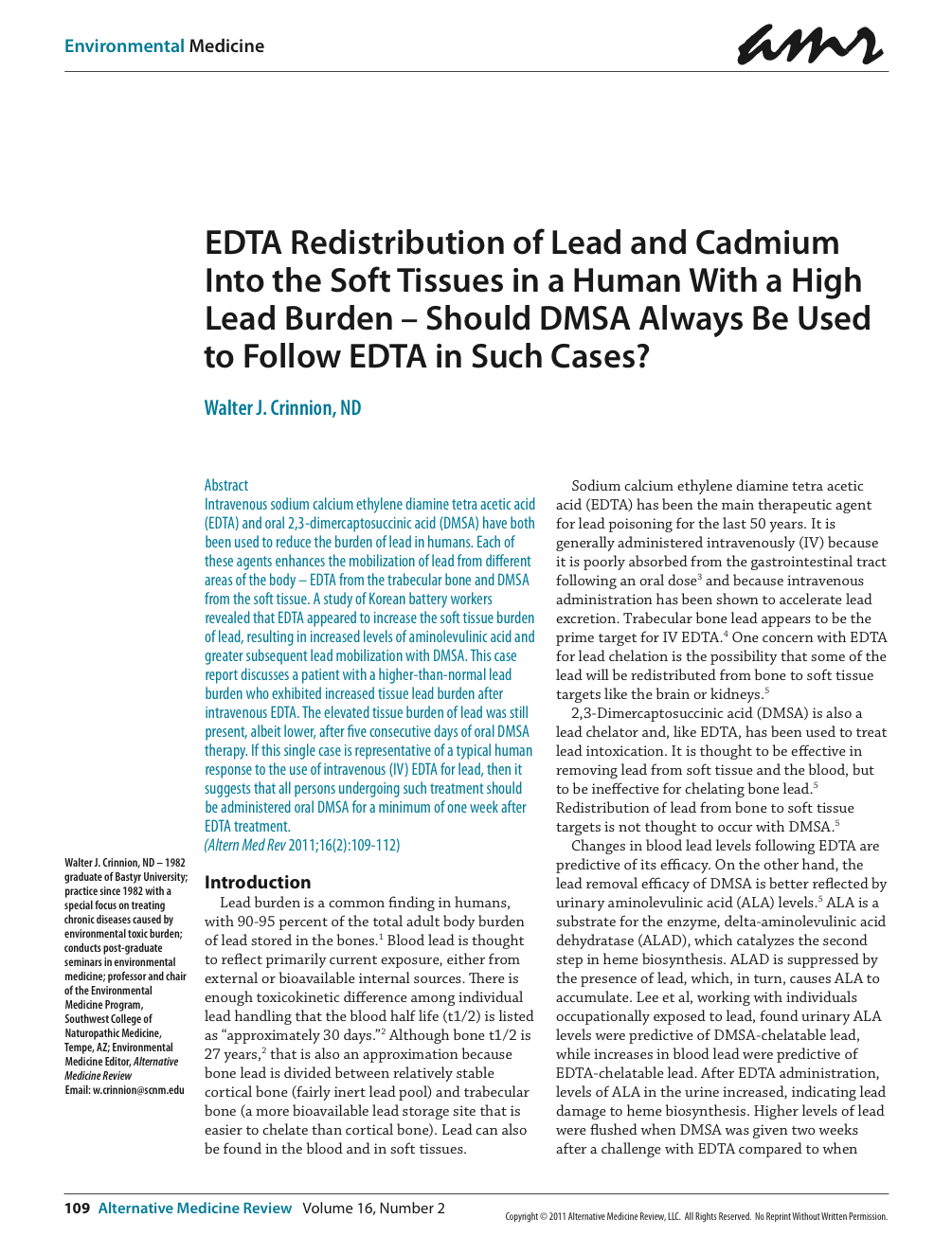 Intravenous sodium calcium ethylene diamine tetra acetic acid (EDTA) and oral 2,3-dimercaptosuccinic acid (DMSA) have both been used to reduce the burden of lead in humans. Each of these agents enhances the mobilization of lead from different areas of the body – EDTA from the trabecular bone and DMSA from the soft tissue. A study of Korean battery workers revealed that EDTA appeared to increase the soft tissue burden of lead, resulting in increased levels of aminolevulinic acid and greater subsequent lead mobilization with DMSA. This case report discusses a patient with a higher-than-normal lead burden who exhibited increased tissue lead burden after intravenous EDTA. The elevated tissue burden of lead was still present, albeit lower, after five consecutive days of oral DMSA therapy. If this single case is representative of a typical human response to the use of intravenous (IV) EDTA for lead, then it suggests that all persons undergoing such treatment should be administered oral DMSA for a minimum of one week after EDTA treatment. (Altern Med Rev 2011;16(2):109-112)