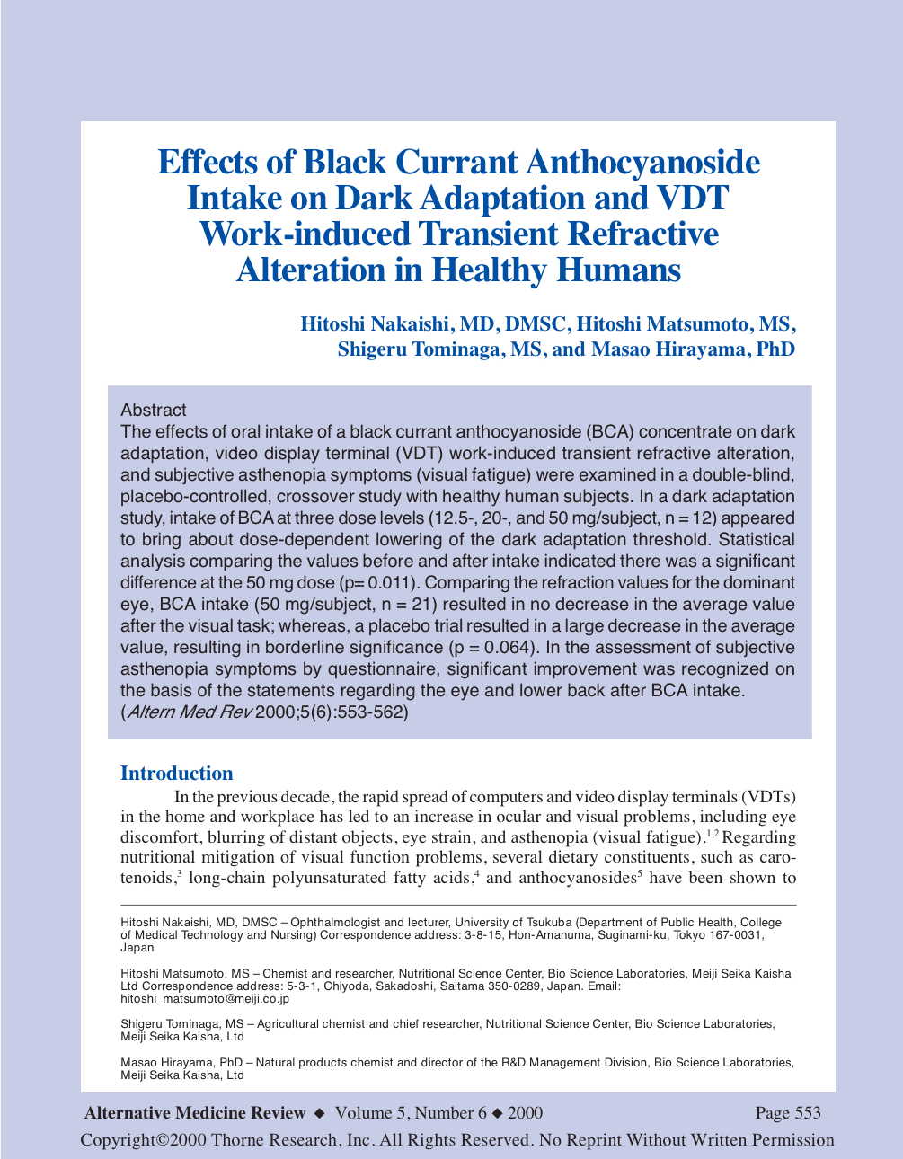 The effects of oral intake of a black currant anthocyanoside (BCA) concentrate on dark adaptation, video display terminal (VDT) work-induced transient refractive alteration, and subjective asthenopia symptoms (visual fatigue) were examined in a double-blind, placebo-controlled, crossover study with healthy human subjects. In a dark adaptation study, intake of BCA at three dose levels (12.5-, 20-, and 50 mg/subject, n = 12) appeared to bring about dose-dependent lowering of the dark adaptation threshold. Statistical analysis comparing the values before and after intake indicated there was a significant difference at the 50 mg dose (p= 0.011). Comparing the refraction values for the dominant eye, BCA intake (50 mg/subject, n = 21) resulted in no decrease in the average value after the visual task; whereas, a placebo trial resulted in a large decrease in the average value, resulting in borderline significance (p = 0.064). In the assessment of subjective asthenopia symptoms by questionnaire, significant improvement was recognized on the basis of the statements regarding the eye and lower back after BCA intake. (Altern Med Rev 2000;5(6):553-562)