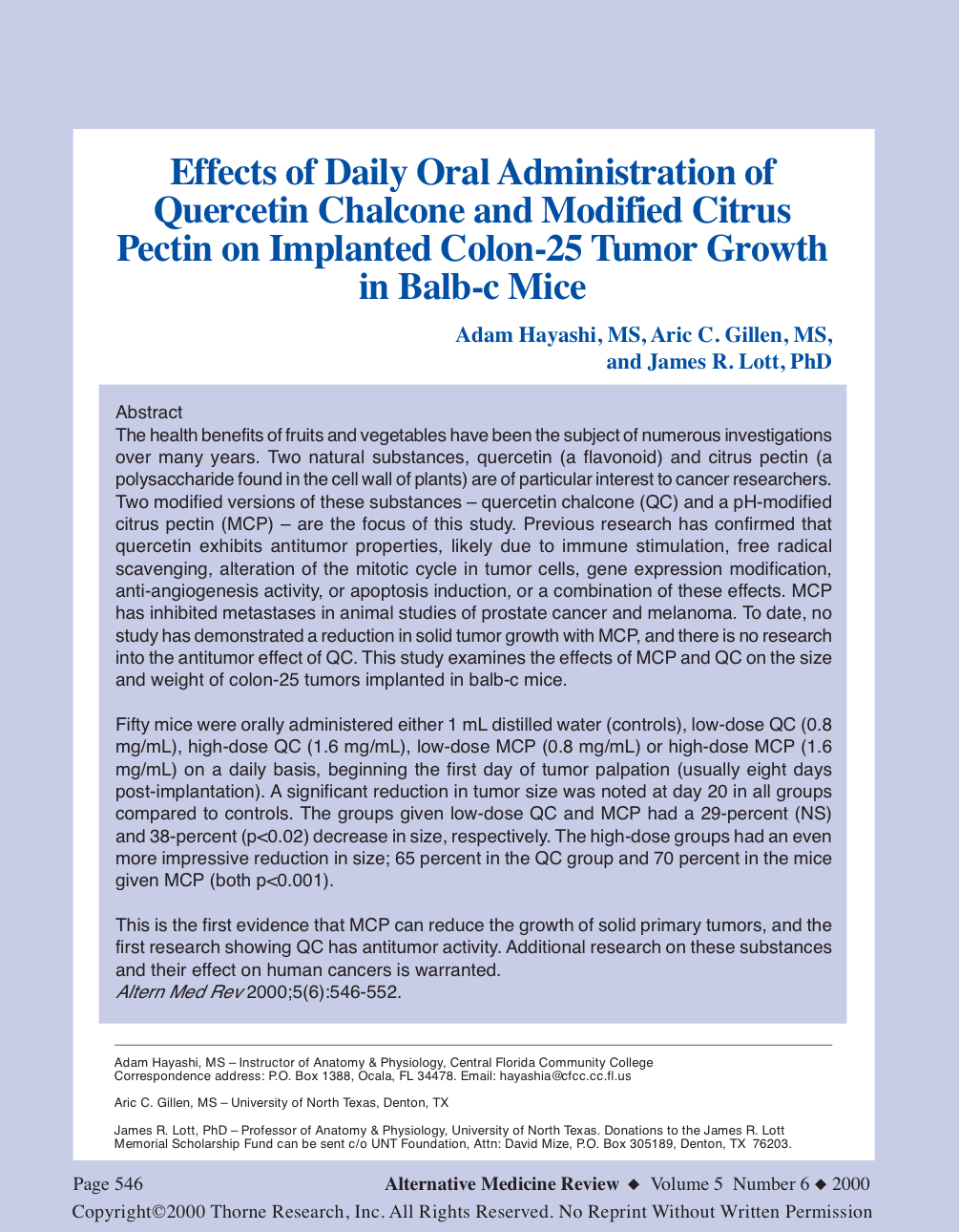 The health benefits of fruits and vegetables have been the subject of numerous investigations over many years. Two natural substances, quercetin (a flavonoid) and citrus pectin (a polysaccharide found in the cell wall of plants) are of particular interest to cancer researchers. Two modified versions of these substances – quercetin chalcone (QC) and a pH-modified citrus pectin (MCP) – are the focus of this study. Previous research has confirmed that quercetin exhibits antitumor properties, likely due to immune stimulation, free radical scavenging, alteration of the mitotic cycle in tumor cells, gene expression modification, anti-angiogenesis activity, or apoptosis induction, or a combination of these effects. MCP has inhibited metastases in animal studies of prostate cancer and melanoma. To date, no study has demonstrated a reduction in solid tumor growth with MCP, and there is no research into the antitumor effect of QC. This study examines the effects of MCP and QC on the size and weight of colon-25 tumors implanted in balb-c mice. Fifty mice were orally administered either 1 mL distilled water (controls), low-dose QC (0.8 mg/mL), high-dose QC (1.6 mg/mL), low-dose MCP (0.8 mg/mL) or high-dose MCP (1.6 mg/mL) on a daily basis, beginning the first day of tumor palpation (usually eight days post-implantation). A significant reduction in tumor size was noted at day 20 in all groups compared to controls. The groups given low-dose QC and MCP had a 29-percent (NS) and 38-percent (p<0.02) decrease in size, respectively. The high-dose groups had an even more impressive reduction in size; 65 percent in the QC group and 70 percent in the mice given MCP (both p<0.001). This is the first evidence that MCP can reduce the growth of solid primary tumors, and the first research showing QC has antitumor activity. Additional research on these substances and their effect on human cancers is warranted. Altern Med Rev 2000;5(6):546-552.[/vc_column_text][/vc_column_inner][vc_column_inner width="1/6"][vc_btn title="Download PDF" color="primary" link="url:%2Fwp-content%2Fuploads%2F2019%2F02%2Fv5-6-546.pdf|title:Download%20PDF|target:%20_blank|" el_class="resource-download"][/vc_column_inner][/vc_row_inner][/vc_column][/vc_row]