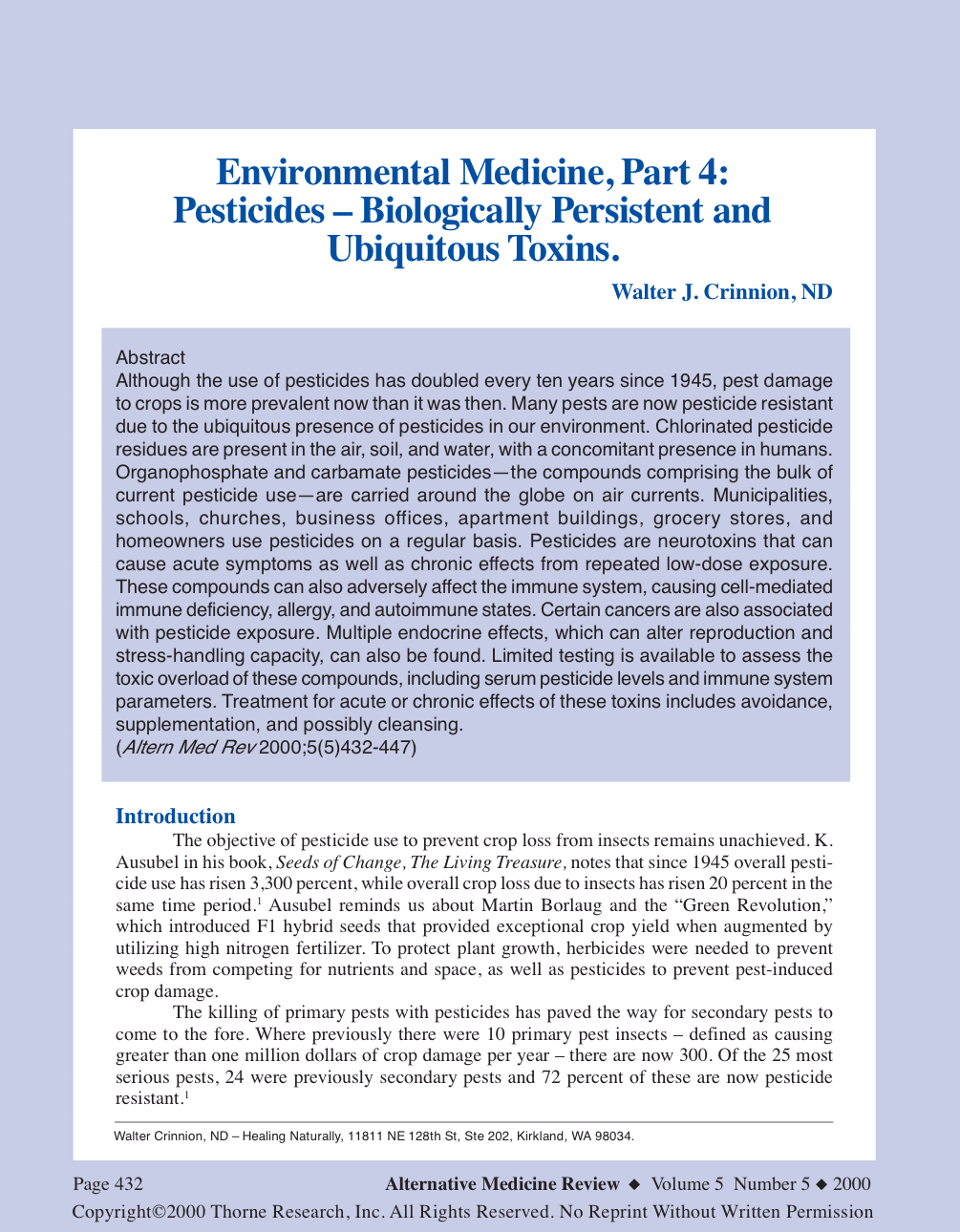 Although the use of pesticides has doubled every ten years since 1945, pest damage to crops is more prevalent now than it was then. Many pests are now pesticide resistant due to the ubiquitous presence of pesticides in our environment. Chlorinated pesticide residues are present in the air, soil, and water, with a concomitant presence in humans. Organophosphate and carbamate pesticides—the compounds comprising the bulk of current pesticide use—are carried around the globe on air currents. Municipalities, schools, churches, business offices, apartment buildings, grocery stores, and homeowners use pesticides on a regular basis. Pesticides are neurotoxins that can cause acute symptoms as well as chronic effects from repeated low-dose exposure. These compounds can also adversely affect the immune system, causing cell-mediated immune deficiency, allergy, and autoimmune states. Certain cancers are also associated with pesticide exposure. Multiple endocrine effects, which can alter reproduction and stress-handling capacity, can also be found. Limited testing is available to assess the toxic overload of these compounds, including serum pesticide levels and immune system parameters. Treatment for acute or chronic effects of these toxins includes avoidance, supplementation, and possibly cleansing. (Altern Med Rev 2000;5(5)432-447)