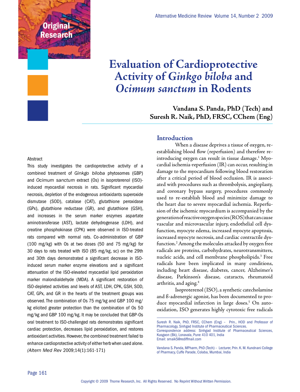 This study investigates the cardioprotective activity of a combined treatment of Ginkgo biloba phytosomes (GBP) and Ocimum sanctum extract (Os) in isoproterenol (ISO)induced myocardial necrosis in rats. Significant myocardial necrosis, depletion of the endogenous antioxidants superoxide dismutase (SOD), catalase (CAT), glutathione peroxidase (GPx), glutathione reductase (GR), and glutathione (GSH), and increases in the serum marker enzymes aspartate aminotransferase (AST), lactate dehydrogenase (LDH), and creatine phosphokinase (CPK) were observed in ISO-treated rats compared with normal rats. Co-administration of GBP (100 mg/kg) with Os at two doses (50 and 75 mg/kg) for 30 days to rats treated with ISO (85 mg/kg, sc) on the 29th and 30th days demonstrated a significant decrease in ISO induced serum marker enzyme elevations and a significant attenuation of the ISO-elevated myocardial lipid peroxidation marker malondialdehyde (MDA). A significant restoration of ISO-depleted activities and levels of AST, LDH, CPK, GSH, SOD, CAT, GPx, and GR in the hearts of the treatment groups was observed. The combination of Os 75 mg/kg and GBP 100 mg/ kg elicited greater protection than the combination of Os 50 mg/kg and GBP 100 mg/kg. It may be concluded that GBP-Os oral treatment to ISO-challenged rats demonstrates significant cardiac protection, decreases lipid peroxidation, and restores antioxidant activities. However, the combined treatment failed to enhance cardioprotective activity of either herb when used alone. (Altern Med Rev 2009;14(1):161-171)