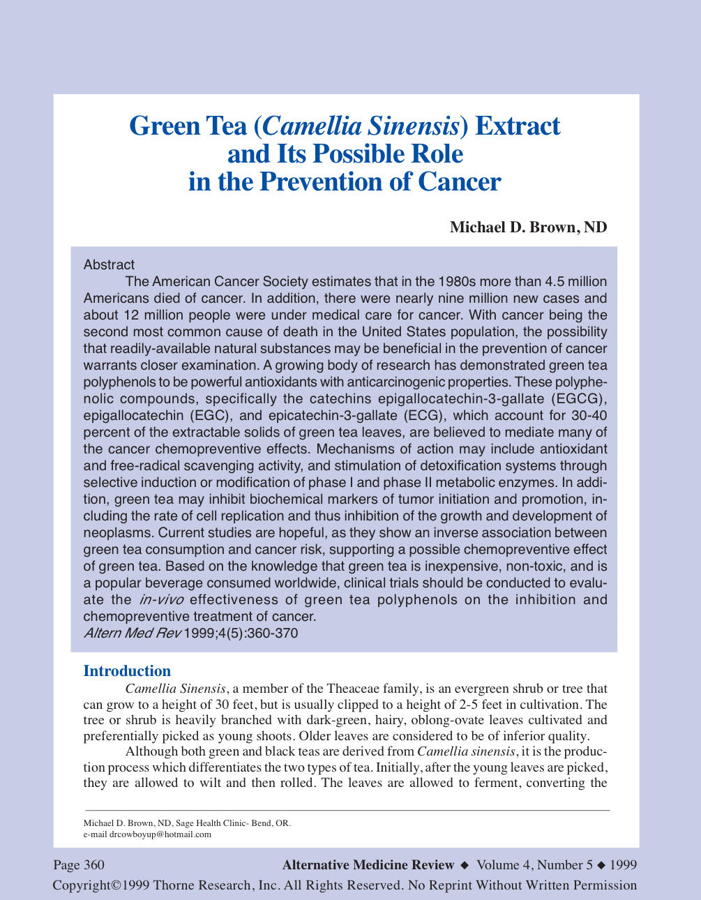 The American Cancer Society estimates that in the 1980s more than 4.5 million Americans died of cancer. In addition, there were nearly nine million new cases and about 12 million people were under medical care for cancer. With cancer being the second most common cause of death in the United States population, the possibility that readily-available natural substances may be beneficial in the prevention of cancer warrants closer examination. A growing body of research has demonstrated green tea polyphenols to be powerful antioxidants with anticarcinogenic properties. These polyphenolic compounds, specifically the catechins epigallocatechin-3-gallate (EGCG), epigallocatechin (EGC), and epicatechin-3-gallate (ECG), which account for 30-40 percent of the extractable solids of green tea leaves, are believed to mediate many of the cancer chemopreventive effects. Mechanisms of action may include antioxidant and free-radical scavenging activity, and stimulation of detoxification systems through selective induction or modification of phase I and phase II metabolic enzymes. In addition, green tea may inhibit biochemical markers of tumor initiation and promotion, including the rate of cell replication and thus inhibition of the growth and development of neoplasms. Current studies are hopeful, as they show an inverse association between green tea consumption and cancer risk, supporting a possible chemopreventive effect of green tea. Based on the knowledge that green tea is inexpensive, non-toxic, and is a popular beverage consumed worldwide, clinical trials should be conducted to evaluate the in-vivo effectiveness of green tea polyphenols on the inhibition and chemopreventive treatment of cancer. Altern Med Rev 1999;4(5):360-370