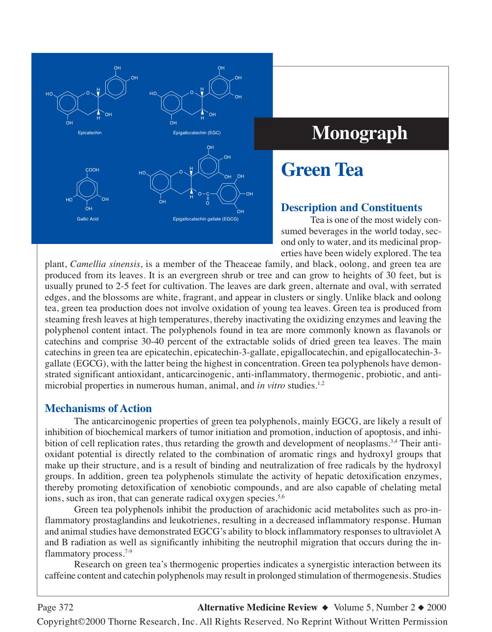 Tea is one of the most widely consumed beverages in the world today, second only to water, and its medicinal properties have been widely explored. The tea plant, Camellia sinensis, is a member of the Theaceae family, and black, oolong, and green tea are produced from its leaves. It is an evergreen shrub or tree and can grow to heights of 30 feet, but is usually pruned to 2-5 feet for cultivation. The leaves are dark green, alternate and oval, with serrated edges, and the blossoms are white, fragrant, and appear in clusters or singly. Unlike black and oolong tea, green tea production does not involve oxidation of young tea leaves. Green tea is produced from steaming fresh leaves at high temperatures, thereby inactivating the oxidizing enzymes and leaving the polyphenol content intact. The polyphenols found in tea are more commonly known as flavanols or catechins and comprise 30-40 percent of the extractable solids of dried green tea leaves. The main catechins in green tea are epicatechin, epicatechin-3-gallate, epigallocatechin, and epigallocatechin-3gallate (EGCG), with the latter being the highest in concentration. Green tea polyphenols have demonstrated significant antioxidant, anticarcinogenic, anti-inflammatory, thermogenic, probiotic, and antimicrobial properties in numerous human, animal, and in vitro studies.1