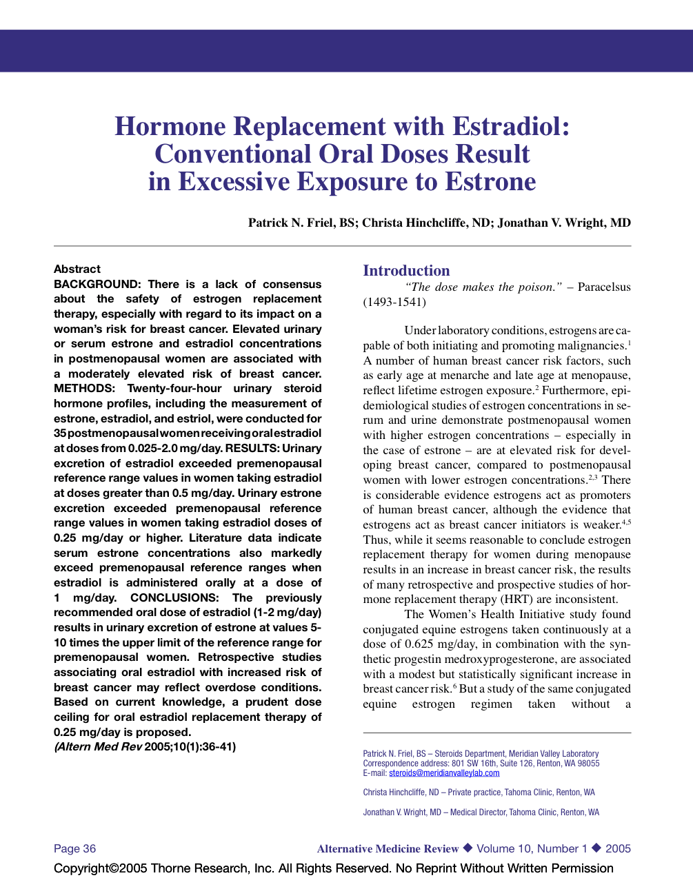 BACKGROUND: There is a lack of consensus about the safety of estrogen replacement therapy, especially with regard to its impact on a woman’s risk for breast cancer. Elevated urinary or serum estrone and estradiol concentrations in postmenopausal women are associated with a moderately elevated risk of breast cancer. METHODS: Twenty-four-hour urinary steroid hormone profiles, including the measurement of estrone, estradiol, and estriol, were conducted for 35 postmenopausal women receiving oral estradiol at doses from 0.025-2.0 mg/day. RESULTS: Urinary excretion of estradiol exceeded premenopausal reference range values in women taking estradiol at doses greater than 0.5 mg/day. Urinary estrone excretion exceeded premenopausal reference range values in women taking estradiol doses of 0.25 mg/day or higher. Literature data indicate serum estrone concentrations also markedly exceed premenopausal reference ranges when estradiol is administered orally at a dose of 1 mg/day. CONCLUSIONS: The previously recommended oral dose of estradiol (1-2 mg/day) results in urinary excretion of estrone at values 5- 10 times the upper limit of the reference range for premenopausal women. Retrospective studies associating oral estradiol with increased risk of breast cancer may reflect overdose conditions. Based on current knowledge, a prudent dose ceiling for oral estradiol replacement therapy of 0.25 mg/day is proposed. (Altern Med Rev 2005;10(1):36-41)