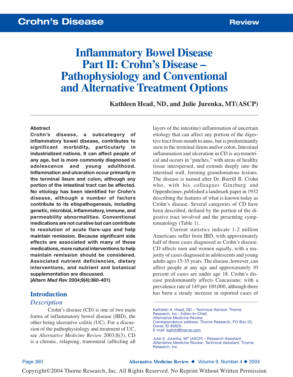 Crohn’s disease, a subcategory of inflammatory bowel disease, contributes to significant morbidity, particularly in industrialized nations. It can affect people of any age, but is more commonly diagnosed in adolescence and young adulthood. Inflammation and ulceration occur primarily in the terminal ileum and colon, although any portion of the intestinal tract can be affected. No etiology has been identified for Crohn’s disease, although a number of factors contribute to its etiopathogenesis, including genetic, microbial, inflammatory, immune, and permeability abnormalities. Conventional medications are not curative but can contribute to resolution of acute flare-ups and help maintain remission. Because significant side effects are associated with many of these medications, more natural interventions to help maintain remission should be considered. Associated nutrient deficiencies, dietary interventions, and nutrient and botanical supplementation are discussed. (Altern Med Rev 2004;9(4):360-401)