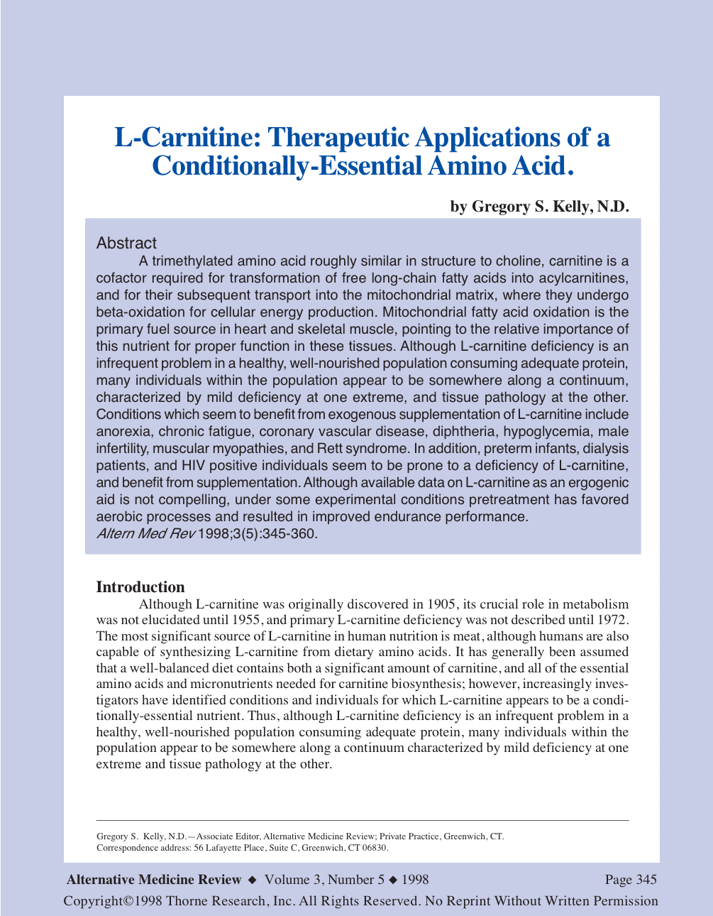 A trimethylated amino acid roughly similar in structure to choline, carnitine is a cofactor required for transformation of free long-chain fatty acids into acylcarnitines, and for their subsequent transport into the mitochondrial matrix, where they undergo beta-oxidation for cellular energy production. Mitochondrial fatty acid oxidation is the primary fuel source in heart and skeletal muscle, pointing to the relative importance of this nutrient for proper function in these tissues. Although L-carnitine deficiency is an infrequent problem in a healthy, well-nourished population consuming adequate protein, many individuals within the population appear to be somewhere along a continuum, characterized by mild deficiency at one extreme, and tissue pathology at the other. Conditions which seem to benefit from exogenous supplementation of L-carnitine include anorexia, chronic fatigue, coronary vascular disease, diphtheria, hypoglycemia, male infertility, muscular myopathies, and Rett syndrome. In addition, preterm infants, dialysis patients, and HIV positive individuals seem to be prone to a deficiency of L-carnitine, and benefit from supplementation. Although available data on L-carnitine as an ergogenic aid is not compelling, under some experimental conditions pretreatment has favored aerobic processes and resulted in improved endurance performance. Altern Med Rev 1998;3(5):345-360.
