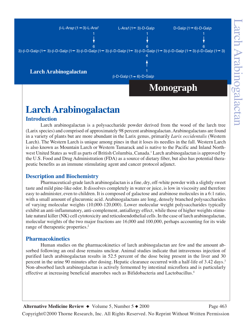 Larch arabinogalactan is a polysaccharide powder derived from the wood of the larch tree (Larix species) and comprised of approximately 98 percent arabinogalactan. Arabinogalactans are found in a variety of plants but are more abundant in the Larix genus, primarily Larix occidentalis (Western Larch). The Western Larch is unique among pines in that it loses its needles in the fall. Western Larch is also known as Mountain Larch or Western Tamarack and is native to the Pacific and Inland North-west United States as well as parts of British Columbia, Canada.1 Larch arabinogalactan is approved by the U.S. Food and Drug Administration (FDA) as a source of dietary fiber, but also has potential thera-peutic benefits as an immune stimulating agent and cancer protocol adjunct.