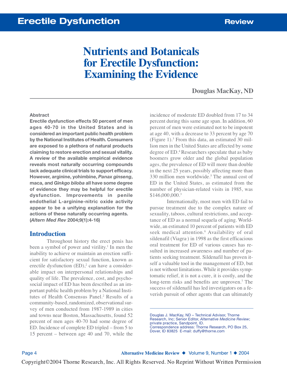 Erectile dysfunction effects 50 percent of men ages 40-70 in the United States and is considered an important public health problem by the National Institutes of Health. Consumers are exposed to a plethora of natural products claiming to restore erection and sexual vitality. A review of the available empirical evidence reveals most naturally occurring compounds lack adequate clinical trials to support efficacy. However, arginine, yohimbine, Panax ginseng, maca, and Ginkgo biloba all have some degree of evidence they may be helpful for erectile dysfunction. Improvements in penile endothelial L-arginine-nitric oxide activity appear to be a unifying explanation for the actions of these naturally occurring agents.(Altern Med Rev 2004;9(1):4-16)