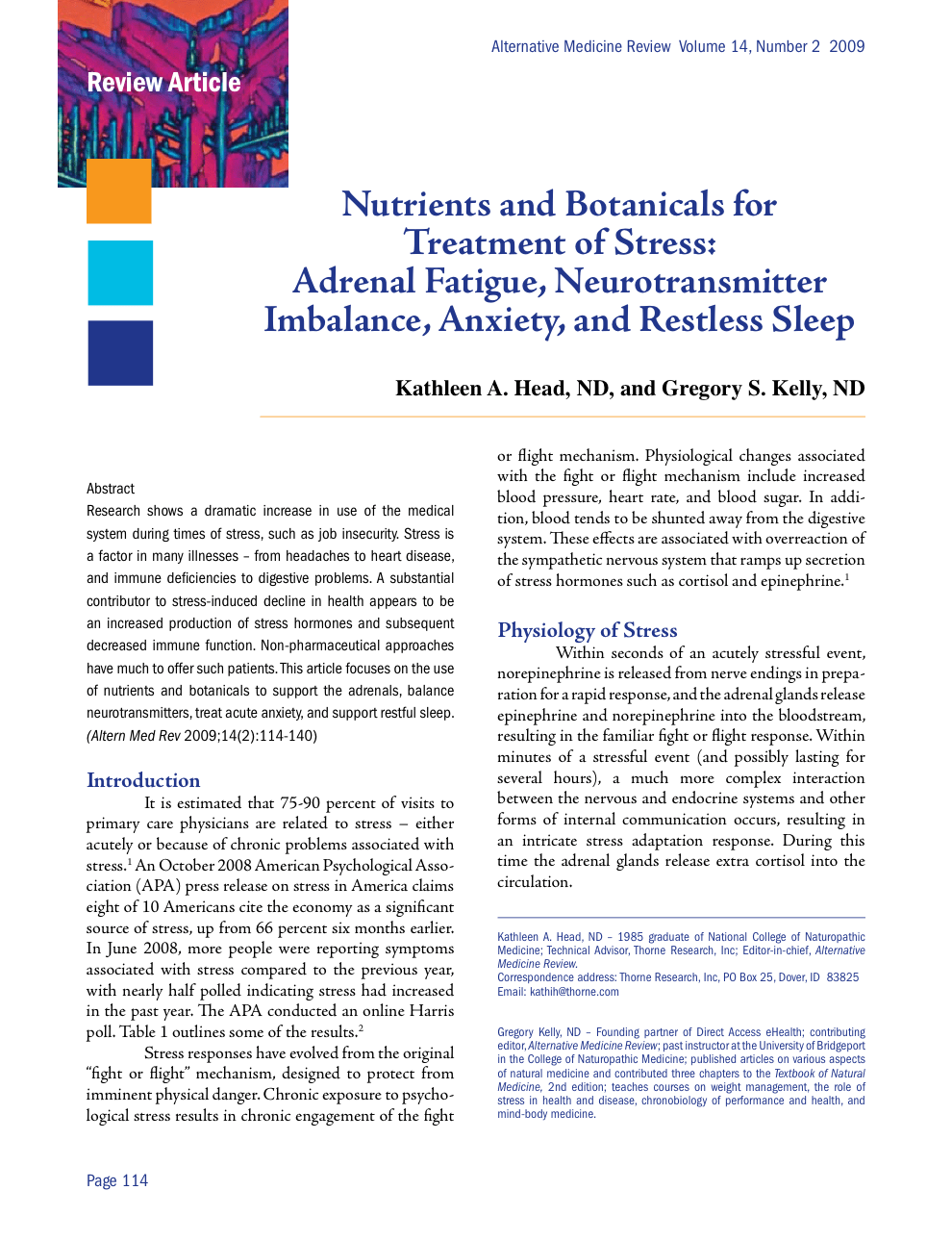 Research shows a dramatic increase in use of the medical system during times of stress, such as job insecurity. Stress is a factor in many illnesses – from headaches to heart disease, and immune deficiencies to digestive problems. A substantial contributor to stress-induced decline in health appears to be an increased production of stress hormones and subsequent decreased immune function. Non-pharmaceutical approaches have much to offer such patients. This article focuses on the use of nutrients and botanicals to support the adrenals, balance neurotransmitters, treat acute anxiety, and support restful sleep. (Altern Med Rev 2009;14(2):114-140)