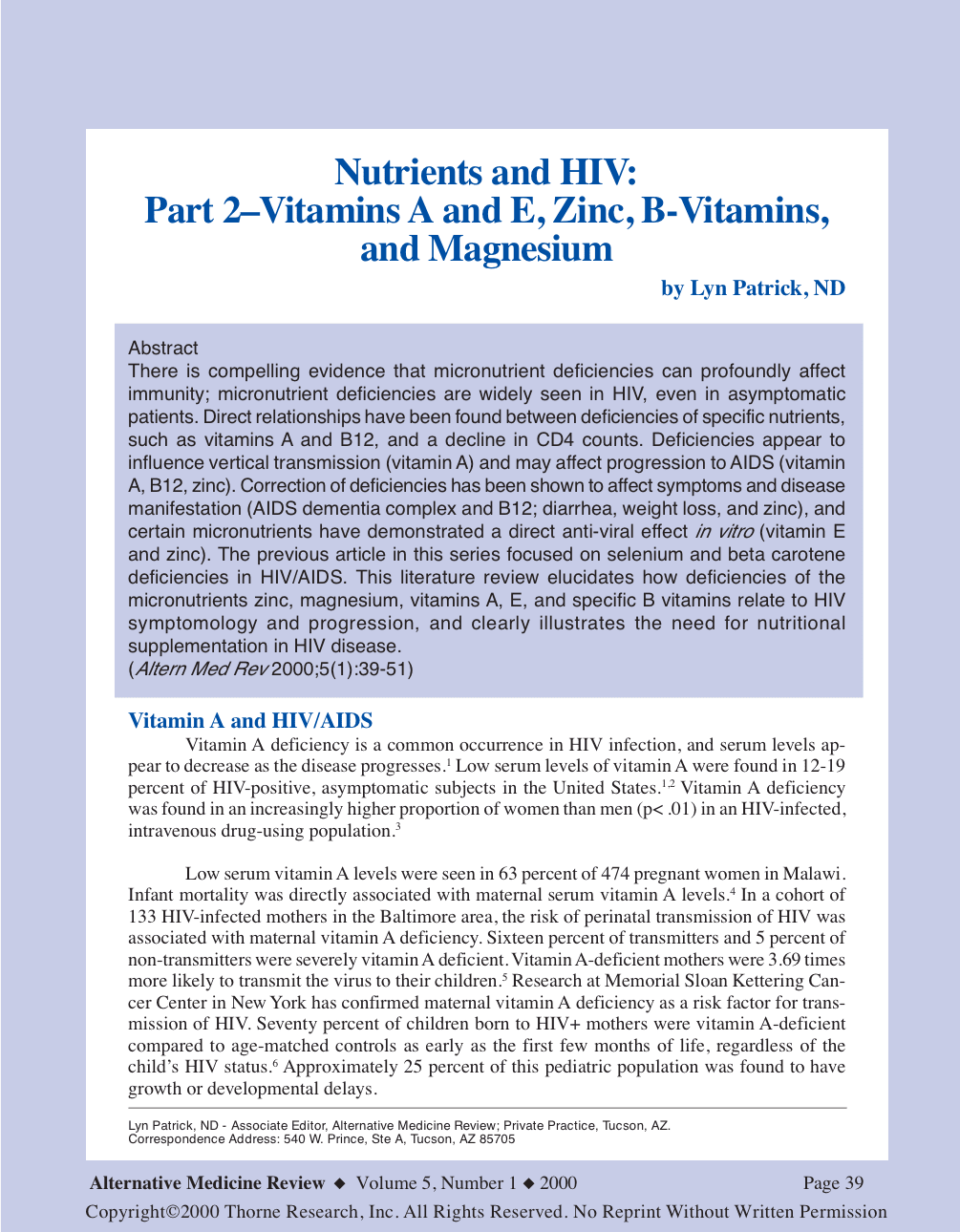 There is compelling evidence that micronutrient deficiencies can profoundly affect immunity; micronutrient deficiencies are widely seen in HIV, even in asymptomatic patients. Direct relationships have been found between deficiencies of specific nutrients, such as vitamins A and B12, and a decline in CD4 counts. Deficiencies appear to influence vertical transmission (vitamin A) and may affect progression to AIDS (vitamin A, B12, zinc). Correction of deficiencies has been shown to affect symptoms and disease manifestation (AIDS dementia complex and B12; diarrhea, weight loss, and zinc), and certain micronutrients have demonstrated a direct anti-viral effect in vitro (vitamin E and zinc). The previous article in this series focused on selenium and beta carotene deficiencies in HIV/AIDS. This literature review elucidates how deficiencies of the micronutrients zinc, magnesium, vitamins A, E, and specific B vitamins relate to HIV symptomology and progression, and clearly illustrates the need for nutritional supplementation in HIV disease. (Altern Med Rev 2000;5(1):39-51)