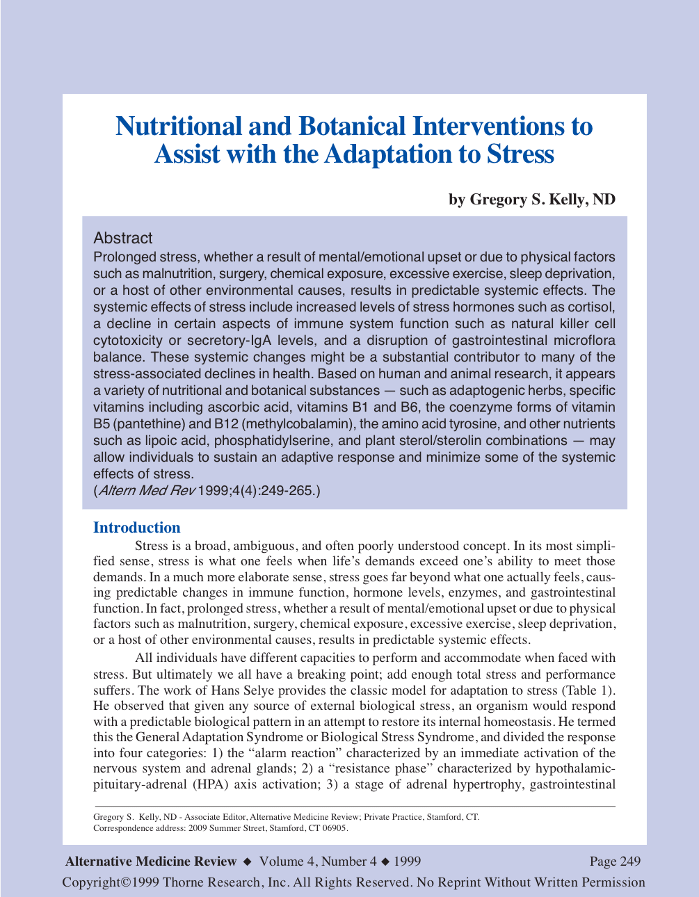 Prolonged stress, whether a result of mental/emotional upset or due to physical factors such as malnutrition, surgery, chemical exposure, excessive exercise, sleep deprivation, or a host of other environmental causes, results in predictable systemic effects. The systemic effects of stress include increased levels of stress hormones such as cortisol, a decline in certain aspects of immune system function such as natural killer cell cytotoxicity or secretory-IgA levels, and a disruption of gastrointestinal microflora balance. These systemic changes might be a substantial contributor to many of the stress-associated declines in health. Based on human and animal research, it appears a variety of nutritional and botanical substances — such as adaptogenic herbs, specific vitamins including ascorbic acid, vitamins B1 and B6, the coenzyme forms of vitamin B5 (pantethine) and B12 (methylcobalamin), the amino acid tyrosine, and other nutrients such as lipoic acid, phosphatidylserine, and plant sterol/sterolin combinations — may allow individuals to sustain an adaptive response and minimize some of the systemic effects of stress. (Altern Med Rev 1999;4(4):249-265.)