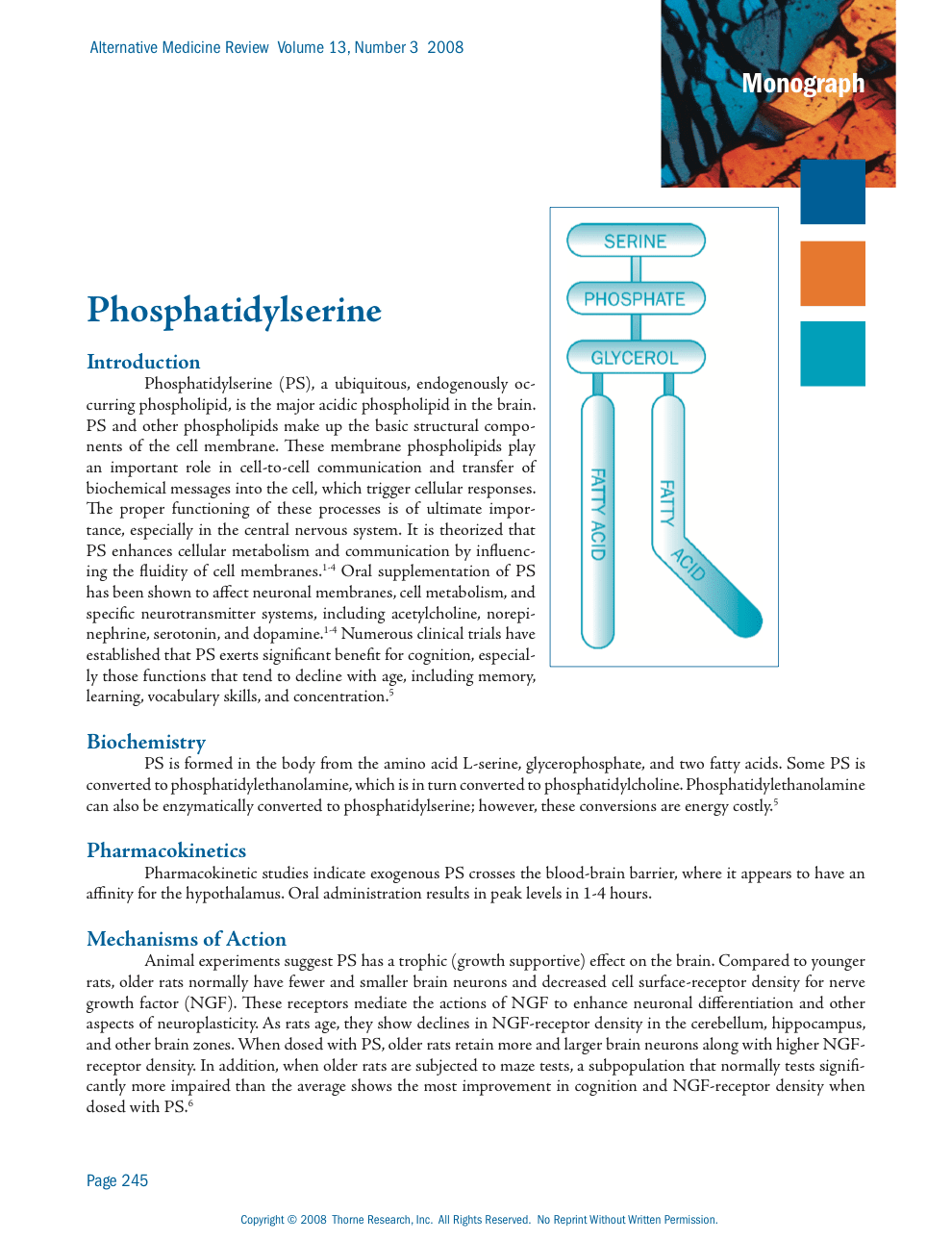 Phosphatidylserine (PS), a ubiquitous, endogenously occurring phospholipid, is the major acidic phospholipid in the brain. PS and other phospholipids make up the basic structural components of the cell membrane. These membrane phospholipids play an important role in cell-to-cell communication and transfer of biochemical messages into the cell, which trigger cellular responses. The proper functioning of these processes is of ultimate importance, especially in the central nervous system. It is theorized that PS enhances cellular metabolism and communication by influencing the fluidity of cell membranes.1-4 Oral supplementation of PS has been shown to affect neuronal membranes, cell metabolism, and specific neurotransmitter systems, including acetylcholine, norepinephrine, serotonin, and dopamine.1-4 Numerous clinical trials have established that PS exerts significant benefit for cognition, especially those functions that tend to decline with age, including memory, learning, vocabulary skills, and concentration.5