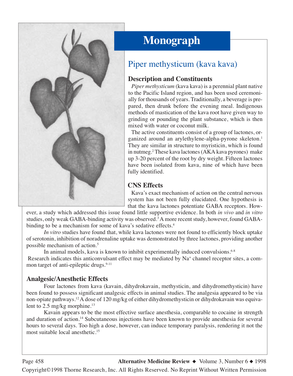 Piper methysticum (kava kava) is a perennial plant native to the Pacific Island region, and has been used ceremonially for thousands of years. Traditionally, a beverage is prepared, then drunk before the evening meal. Indigenous methods of mastication of the kava root have given way to grinding or pounding the plant substance, which is then mixed with water or coconut milk. The active constituents consist of a group of lactones, organized around an arylethylene-alpha-pyrone skeleton.1 They are similar in structure to myristicin, which is found in nutmeg.2 These kava lactones (AKA kava pyrones) make up 3-20 percent of the root by dry weight. Fifteen lactones have been isolated from kava, nine of which have been fully identified.