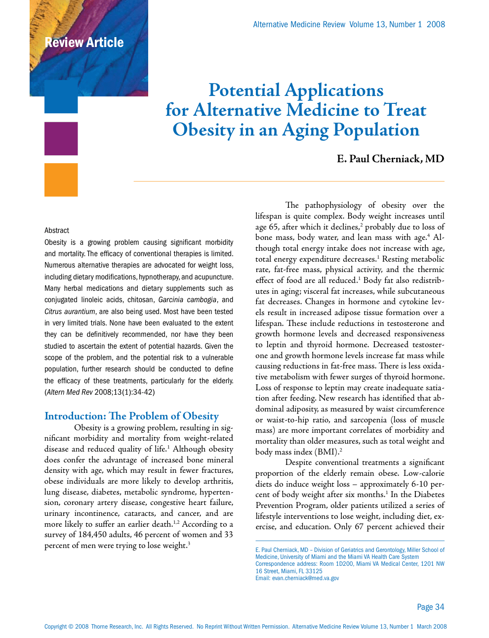 Obesity is a growing problem causing significant morbidity and mortality. The efficacy of conventional therapies is limited. Numerous alternative therapies are advocated for weight loss, including dietary modifications, hypnotherapy, and acupuncture. Many herbal medications and dietary supplements such as conjugated linoleic acids, chitosan, Garcinia cambogia, and Citrus aurantium, are also being used. Most have been tested in very limited trials. None have been evaluated to the extent they can be definitively recommended, nor have they been studied to ascertain the extent of potential hazards. Given the scope of the problem, and the potential risk to a vulnerable population, further research should be conducted to define the efficacy of these treatments, particularly for the elderly. (Altern Med Rev 2008;13(1):34-42)