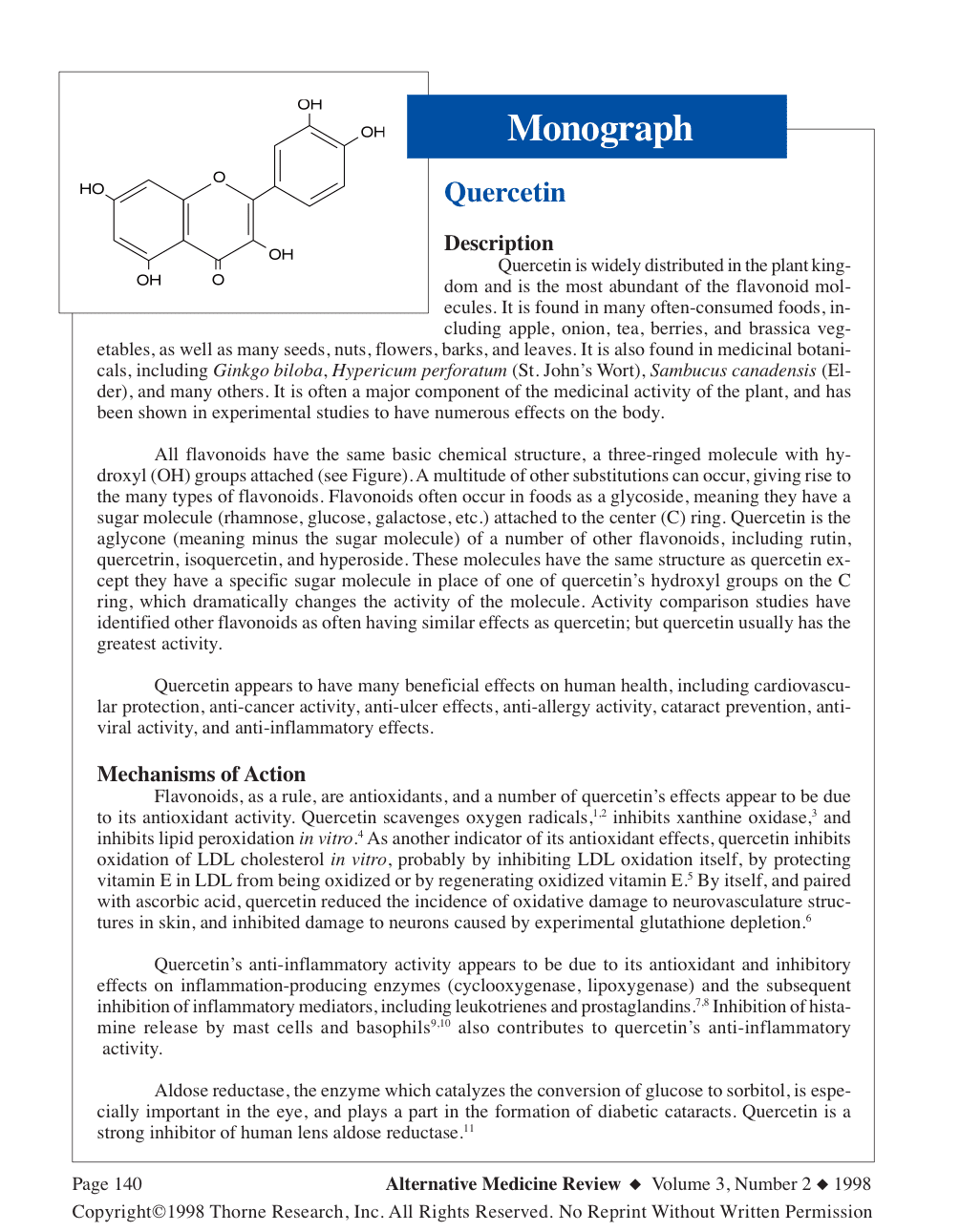 Quercetin is widely distributed in the plant kingdom and is the most abundant of the flavonoid molecules. It is found in many often-consumed foods, including apple, onion, tea, berries, and brassica vegetables, as well as many seeds, nuts, flowers, barks, and leaves. It is also found in medicinal botanicals, including Ginkgo biloba, Hypericum perforatum (St. John’s Wort), Sambucus canadensis (Elder), and many others. It is often a major component of the medicinal activity of the plant, and has been shown in experimental studies to have numerous effects on the body.