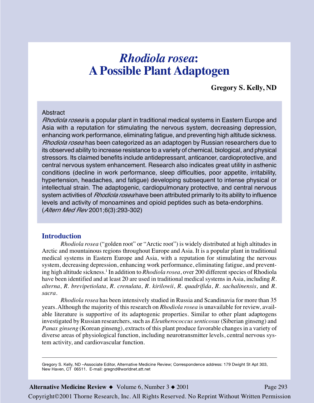 Rhodiola rosea is a popular plant in traditional medical systems in Eastern Europe and Asia with a reputation for stimulating the nervous system, decreasing depression, enhancing work performance, eliminating fatigue, and preventing high altitude sickness. Rhodiola rosea has been categorized as an adaptogen by Russian researchers due to its observed ability to increase resistance to a variety of chemical, biological, and physical stressors. Its claimed benefits include antidepressant, anticancer, cardioprotective, and central nervous system enhancement. Research also indicates great utility in asthenic conditions (decline in work performance, sleep difficulties, poor appetite, irritability, hypertension, headaches, and fatigue) developing subsequent to intense physical or intellectual strain. The adaptogenic, cardiopulmonary protective, and central nervous system activities of Rhodiola rosea have been attributed primarily to its ability to influence levels and activity of monoamines and opioid peptides such as beta-endorphins. (Altern Med Rev 2001;6(3):293-302)