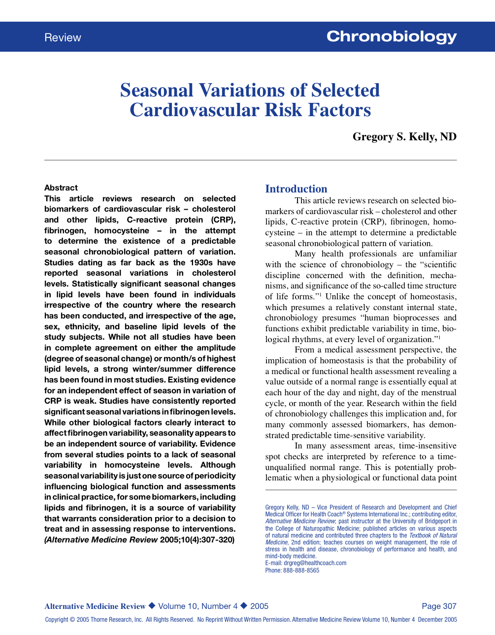 This article reviews research on selected biomarkers of cardiovascular risk – cholesterol and other lipids, C-reactive protein (CRP), fibrinogen, homocysteine – in the attempt to determine the existence of a predictable seasonal chronobiological pattern of variation. Studies dating as far back as the 1930s have reported seasonal variations in cholesterol levels. Statistically significant seasonal changes in lipid levels have been found in individuals irrespective of the country where the research has been conducted, and irrespective of the age, sex, ethnicity, and baseline lipid levels of the study subjects. While not all studies have been in complete agreement on either the amplitude (degree of seasonal change) or month/s of highest lipid levels, a strong winter/summer difference has been found in most studies. Existing evidence for an independent effect of season in variation of CRP is weak. Studies have consistently reported significant seasonal variations in fibrinogen levels. While other biological factors clearly interact to affect fibrinogen variability, seasonality appears to be an independent source of variability. Evidence from several studies points to a lack of seasonal variability in homocysteine levels. Although seasonal variability is just one source of periodicity influencing biological function and assessments in clinical practice, for some biomarkers, including lipids and fibrinogen, it is a source of variability that warrants consideration prior to a decision to treat and in assessing response to interventions. (Alternative Medicine Review 2005;10(4):307-320)