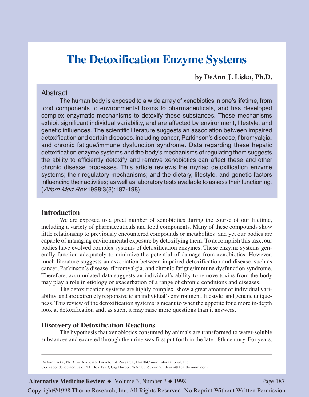 The human body is exposed to a wide array of xenobiotics in one’s lifetime, from food components to environmental toxins to pharmaceuticals, and has developed complex enzymatic mechanisms to detoxify these substances. These mechanisms exhibit significant individual variability, and are affected by environment, lifestyle, and genetic influences. The scientific literature suggests an association between impaired detoxification and certain diseases, including cancer, Parkinson’s disease, fibromyalgia, and chronic fatigue/immune dysfunction syndrome. Data regarding these hepatic detoxification enzyme systems and the body’s mechanisms of regulating them suggests the ability to efficiently detoxify and remove xenobiotics can affect these and other chronic disease processes. This article reviews the myriad detoxification enzyme systems; their regulatory mechanisms; and the dietary, lifestyle, and genetic factors influencing their activities; as well as laboratory tests available to assess their functioning. (Altern Med Rev 1998;3(3):187-198)