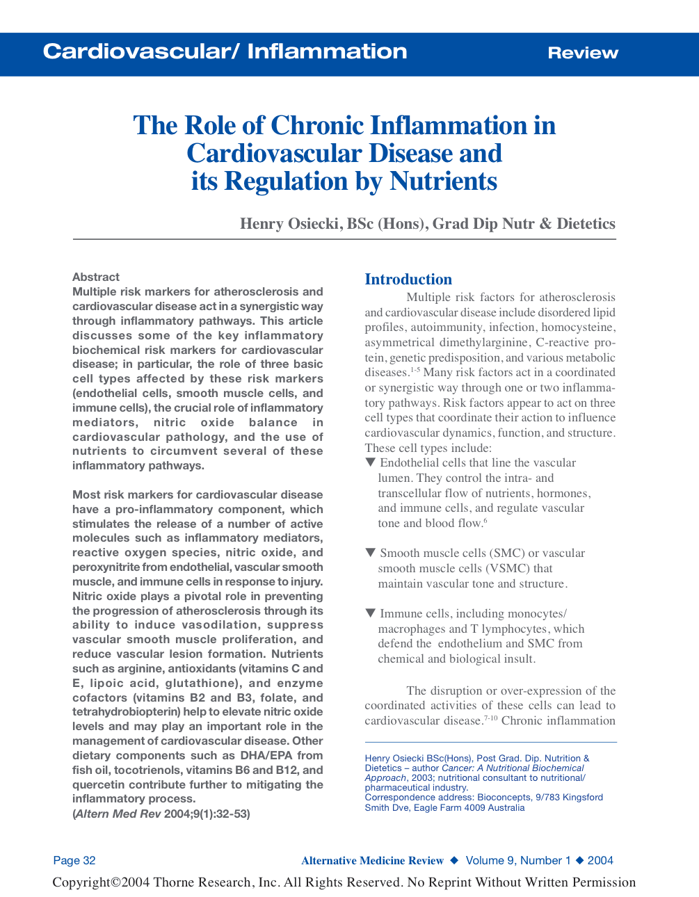 Multiple risk markers for atherosclerosis and cardiovascular disease act in a synergistic way through inflammatory pathways. This article discusses some of the key inflammatory biochemical risk markers for cardiovascular disease; in particular, the role of three basic cell types affected by these risk markers (endothelial cells, smooth muscle cells, and immune cells), the crucial role of inflammatory mediators, nitric oxide balance in cardiovascular pathology, and the use of nutrients to circumvent several of these inflammatory pathways. Most risk markers for cardiovascular disease have a pro-inflammatory component, which stimulates the release of a number of active molecules such as inflammatory mediators, reactive oxygen species, nitric oxide, and peroxynitrite from endothelial, vascular smooth muscle, and immune cells in response to injury. Nitric oxide plays a pivotal role in preventing the progression of atherosclerosis through its ability to induce vasodilation, suppress vascular smooth muscle proliferation, and reduce vascular lesion formation. Nutrients such as arginine, antioxidants (vitamins C and E, lipoic acid, glutathione), and enzyme cofactors (vitamins B2 and B3, folate, and tetrahydrobiopterin) help to elevate nitric oxide levels and may play an important role in the management of cardiovascular disease. Other dietary components such as DHA/EPA from fish oil, tocotrienols, vitamins B6 and B12, and quercetin contribute further to mitigating the inflammatory process. (Altern Med Rev 2004;9(1):32-53)