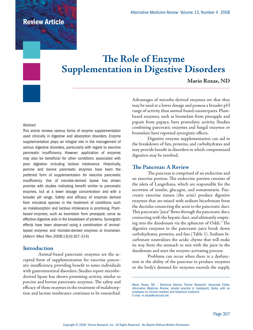 This article reviews various forms of enzyme supplementation used clinically in digestive and absorption disorders. Enzyme supplementation plays an integral role in the management of various digestive disorders, particularly with regard to exocrine pancreatic insufficiency. However, application of enzymes may also be beneficial for other conditions associated with poor digestion including lactose intolerance. Historically, porcine and bovine pancreatic enzymes have been the preferred form of supplementation for exocrine pancreatic insufficiency. Use of microbe-derived lipase has shown promise with studies indicating benefit similar to pancreatic enzymes, but at a lower dosage concentration and with a broader pH range. Safety and efficacy of enzymes derived from microbial species in the treatment of conditions such as malabsorption and lactose intolerance is promising. Plant Based enzymes, such as bromelain from pineapple, serve as effective digestive aids in the breakdown of proteins. Synergistic effects have been observed using a combination of animal based enzymes and microbe-derived enzymes or bromelain. (Altern Med Rev 2008;13(4):307-314)